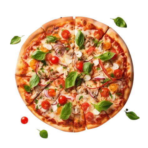A fresh and healthy pizza topped with colorful bell peppers, tomatoes, onions, mushrooms, black olives, and a generous layer of mozzarella cheese.